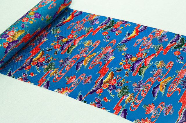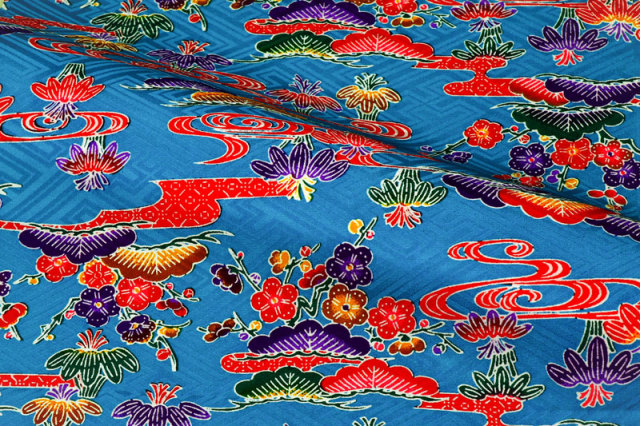 本品は、その紅型模様を和柄生地として再現した国産生地で、衣装やインテリア、和小物作りに幅広くご利用いただけます。
