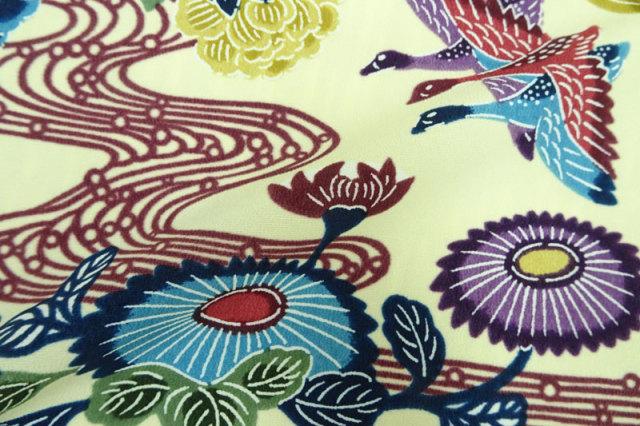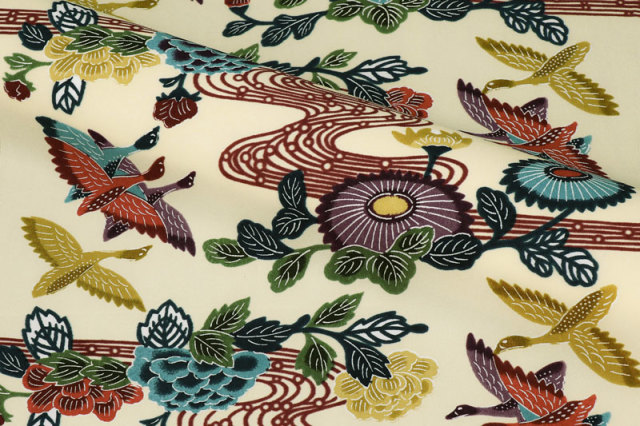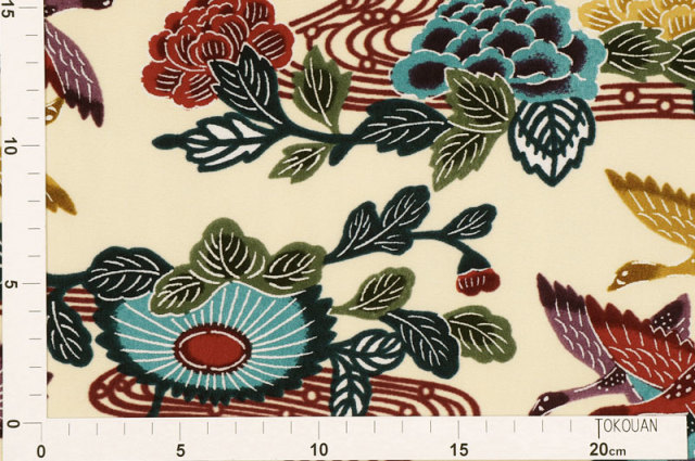 本品は、その紅型模様を和柄生地として再現した国産生地で、衣装やインテリア、和小物作りに幅広くご利用いただけます。