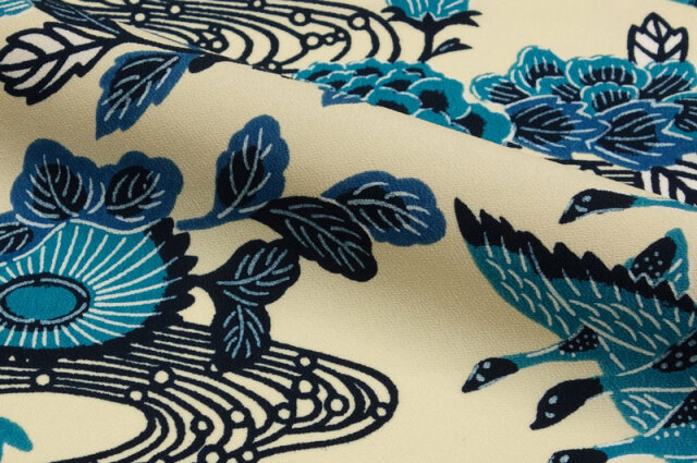 本品は、その紅型模様を和柄生地として再現した国産生地で、衣装やインテリア、和小物作りに幅広くご利用いただけます。