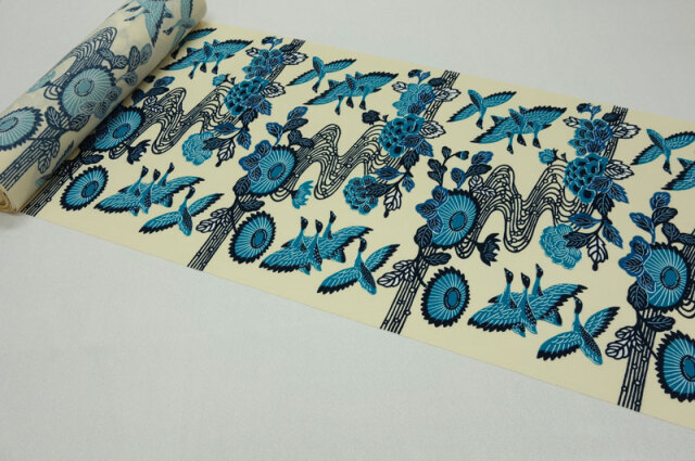 型紙を使い、防染糊を置いてから手作業で彩色するため、一枚ごとに味わい深い仕上がりとなります。
