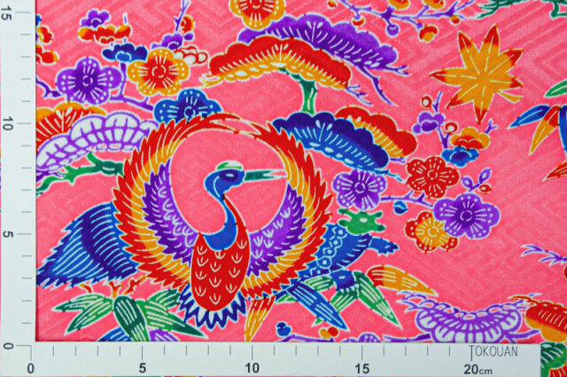 本品は、その紅型模様を和柄生地として再現した国産生地で、衣装やインテリア、和小物作りに幅広くご利用いただけます。