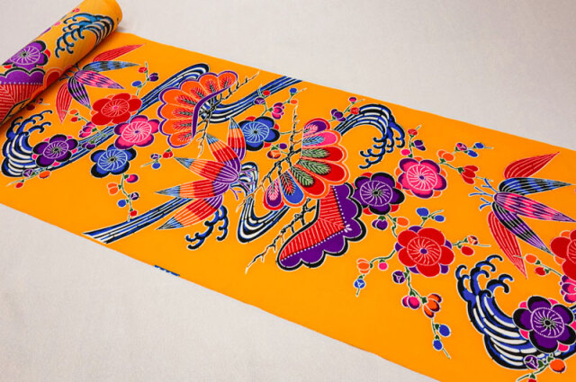 色鮮やかな美しい色彩と、文様に特徴がある染め物です。