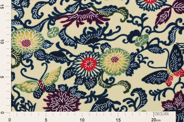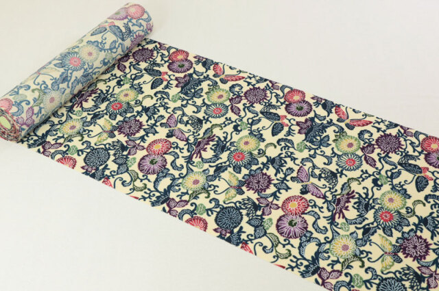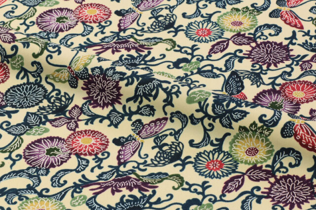 本品は、その紅型模様を和柄生地として再現した国産生地で、衣装やインテリア、和小物作りに幅広くご利用いただけます。