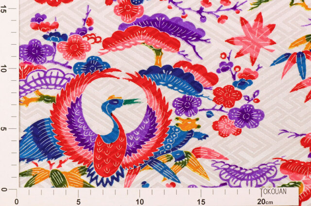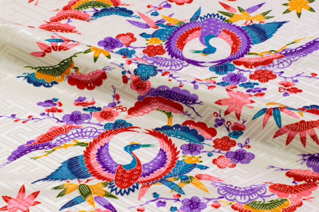 本品は、その紅型模様を和柄生地として再現した国産生地で、衣装やインテリア、和小物作りに幅広くご利用いただけます。