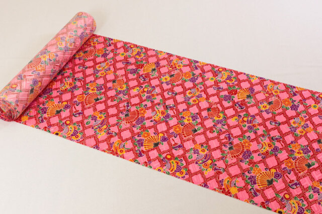 本品は、その紅型模様を和柄生地として再現した国産生地で、衣装やインテリア、和小物作りに幅広くご利用いただけます。