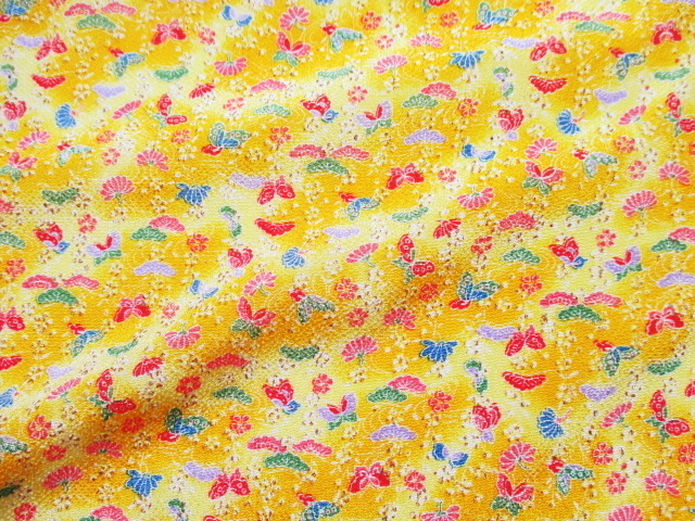 京友禅 金彩ちりめん 蝶に松菊桜(山吹)