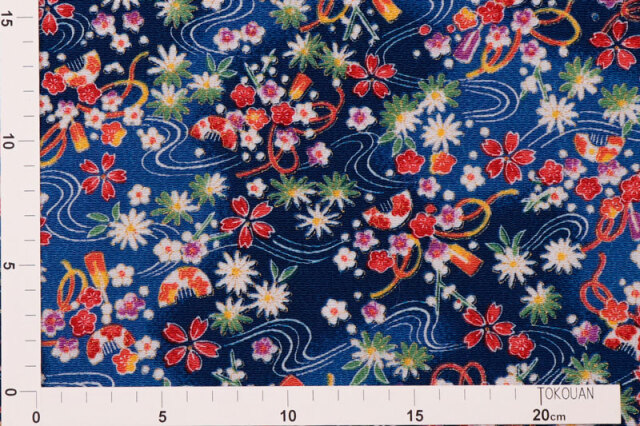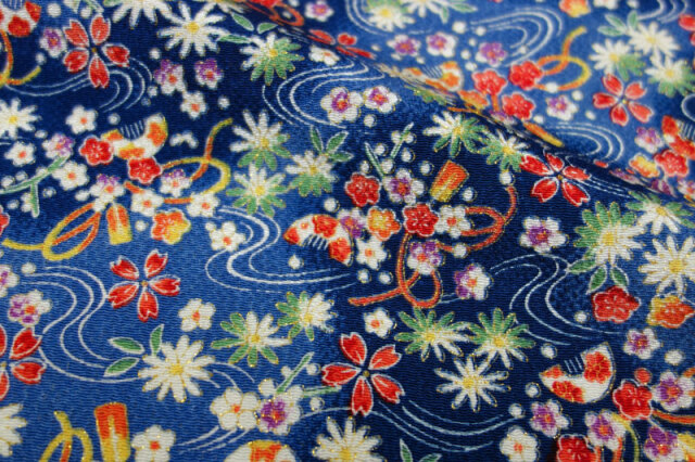 金彩ちりめんは、表面にシボ(凹凸)のある縮緬生地に、きらりと光る金彩を施した和柄生地です。