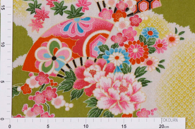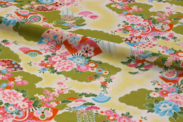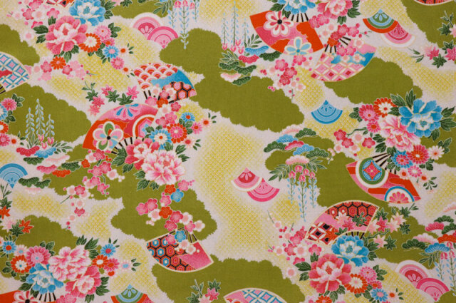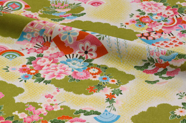 京・一越ちりめん 鹿の子霞に扇(抹茶)