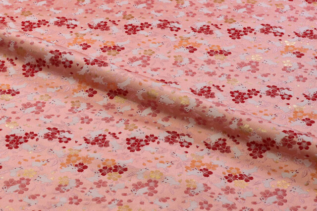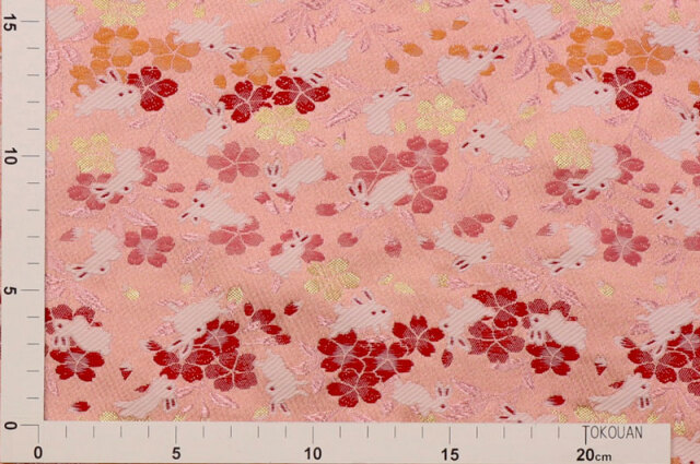 春らしい桃色地に、桜の間を兎が遊ぶ可愛らしい柄の金襴生地です。