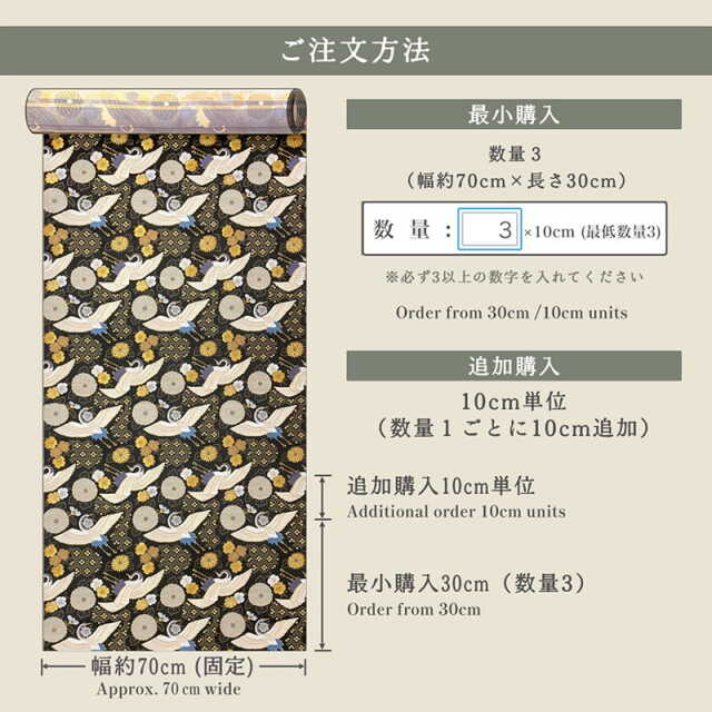 数量5→50cm数量10→1m と、数量が1増えるごとに生地の長さが10cmずつ増えます。 ご注文いただいた数量分は、続けて1枚(つながった状態)でカットいたします。 恐れ入りますが、最低単位は30cm (数量3)からとなります。数量は「3」以上でお願いいたします。