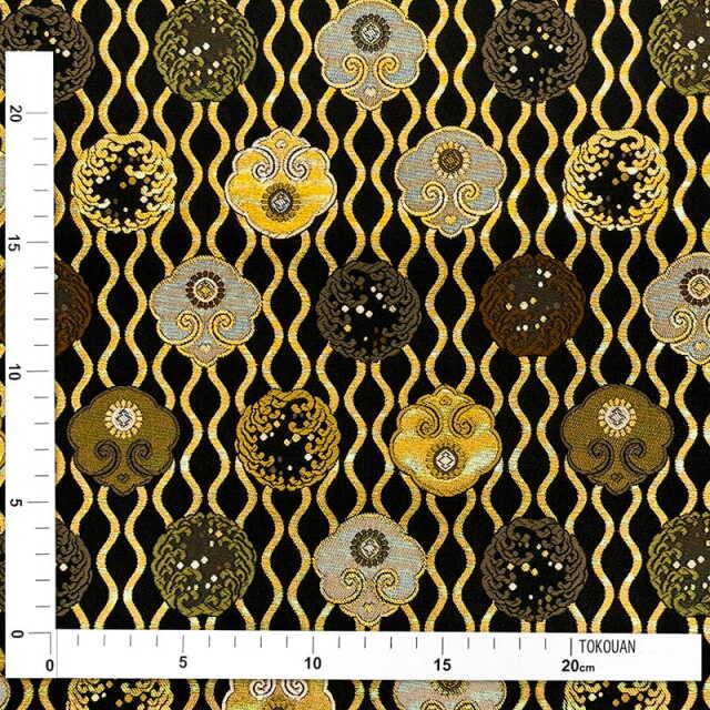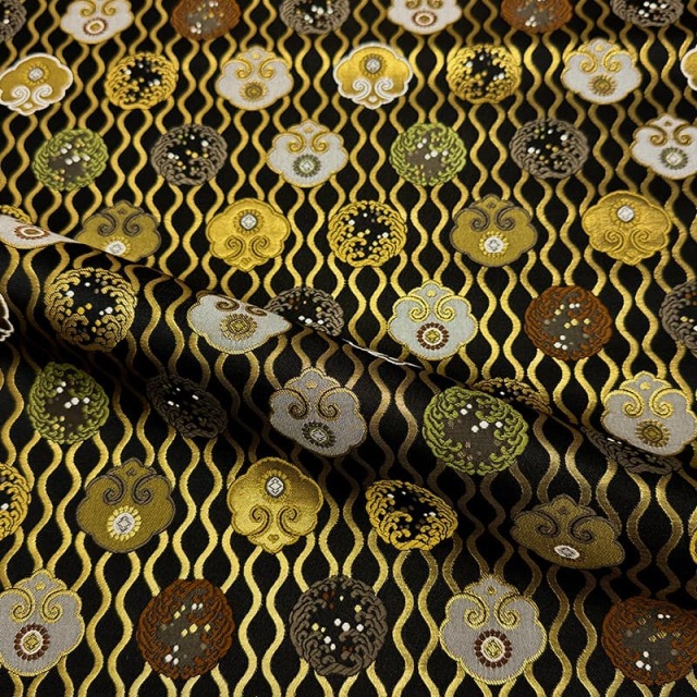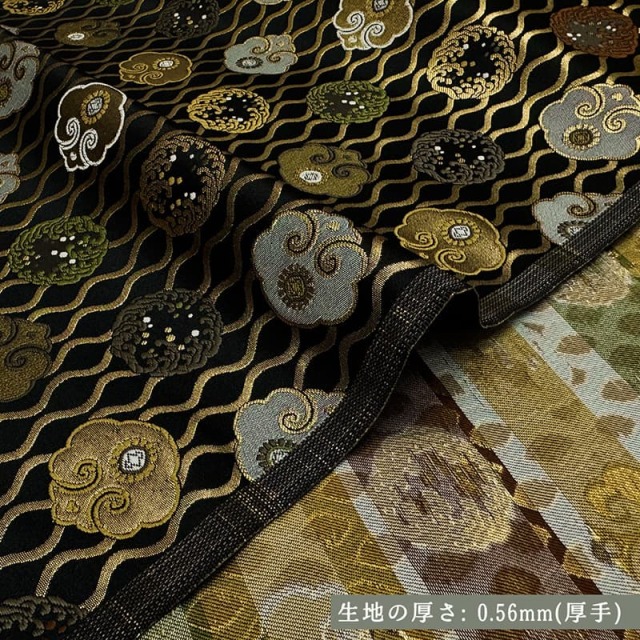 こちらの和柄生地は、黒の織地に、金、緑、黄色などの古典文様が配された、華やかな金襴生地です。どんなシーンでも使いやすい生地です。