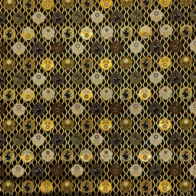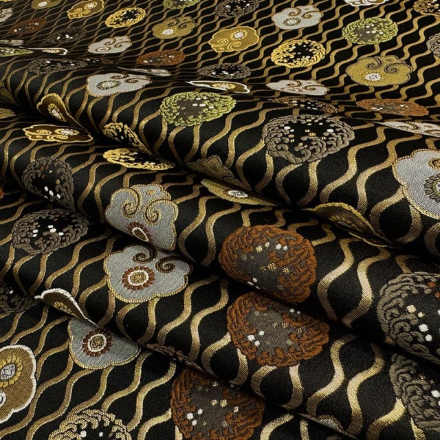 ブラックの地にゴールドやグリーン、イエローの古典文様が織り込まれた生地は、大人から子どもまで幅広い世代に親しまれています。インテリアや土産品、ペット用衣装など、多様な分野で活用されています。