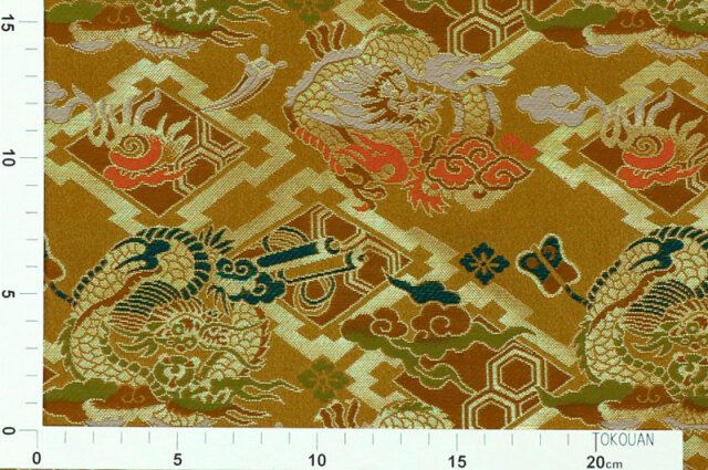 こちらの和柄生地は、金色を帯びた明るい茶系色である、黄金金茶の織地に、赤、緑、白色などの龍の柄や宝文様などが織り出された金襴生地です。落ち着いた色使いでどんなシーンでも使いやすい生地です。