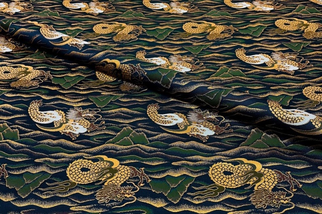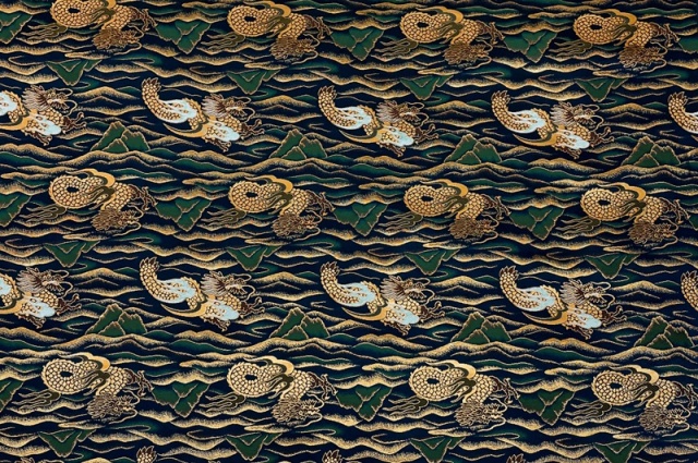 連なる山々を龍が飛び舞う文様の金襴生地です。