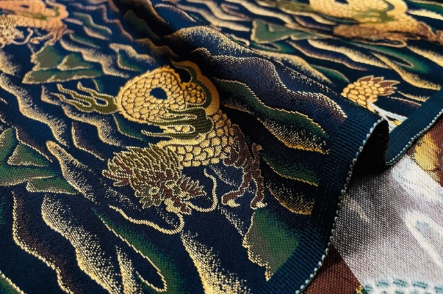 深みのあるネイビーカラーの織地に、落ち着いたゴールドカラーの龍の文様を織り出した金襴生地で、大人の趣味から、お子様や園児、学生まで、幅広い層にご利用頂けます。宮司や僧侶など、伝統的な職業の方々にも重宝されているほか、インテリアやお土産品を製造する土産品製造者や工務店の方々にも人気の素材です。犬の服や小物にも使用されることから、ペット用のアパレルにも応用可能です。