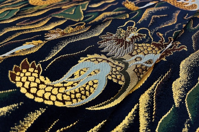 こちらの和柄生地は、深みのある紺色の織地に、落ち着いた金色の龍の文様を織り出した金襴生地です。どんなシーンでも使いやすい生地です。