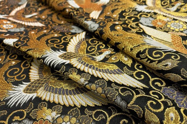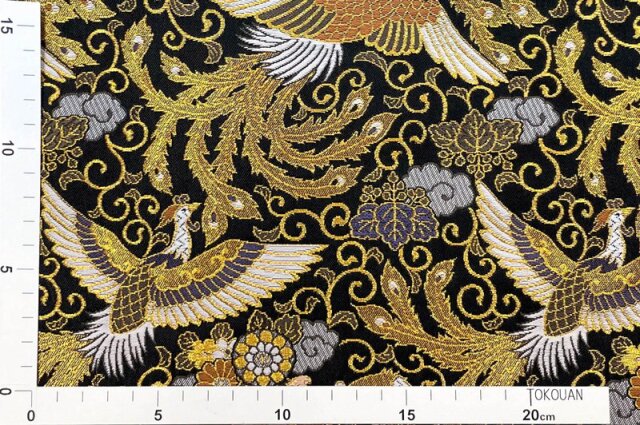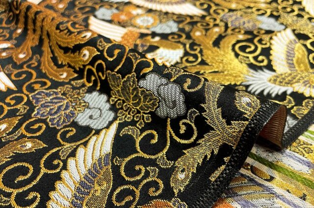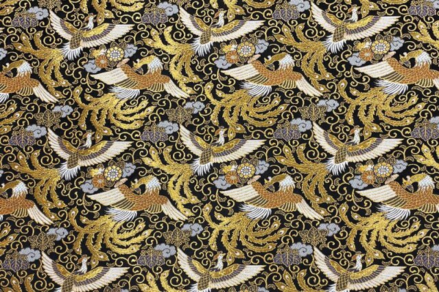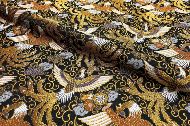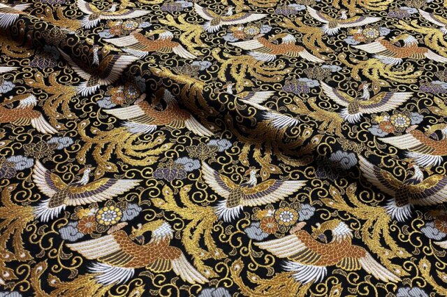 こちらの和柄生地は、黒の織地に、白や金糸などを使った、縁起の良い鳳凰柄の金襴生地です。どんなシーンでも使いやすい生地です。