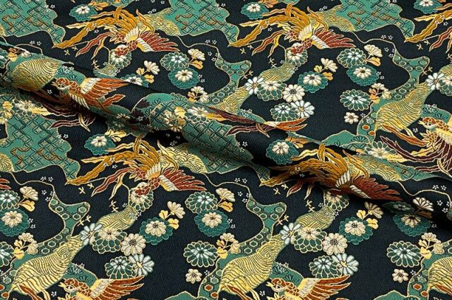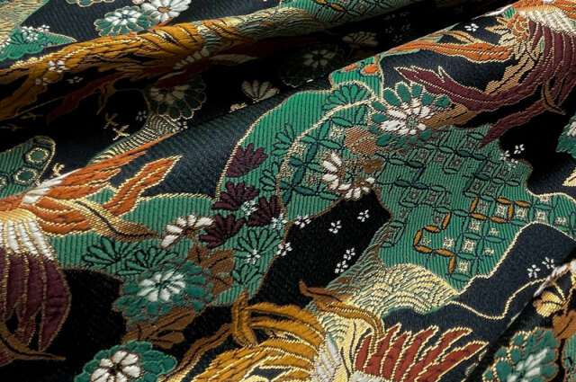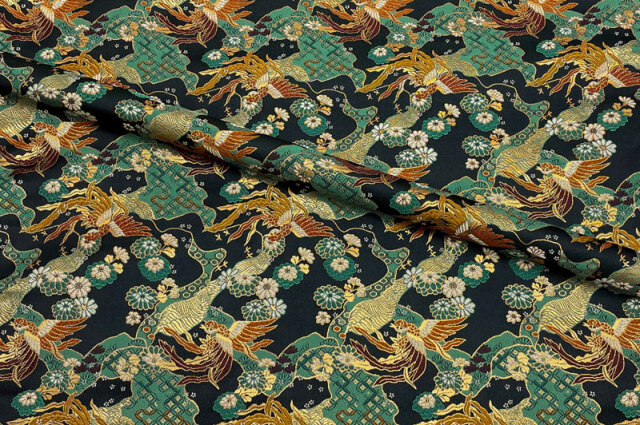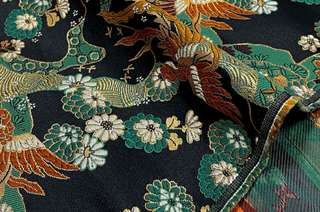 こちらの和柄生地は、黒の織地に、赤みのある鳳凰や、緑や白などの花々を織り上げた金襴生地です。どんなシーンでも使いやすい生地です。