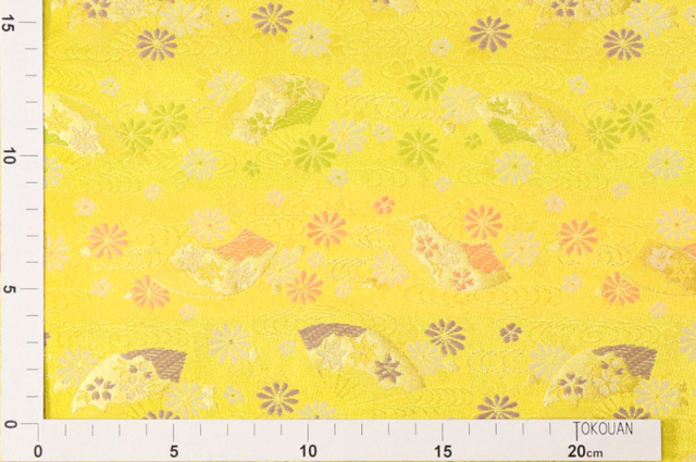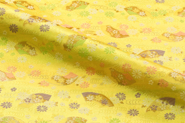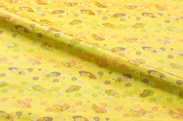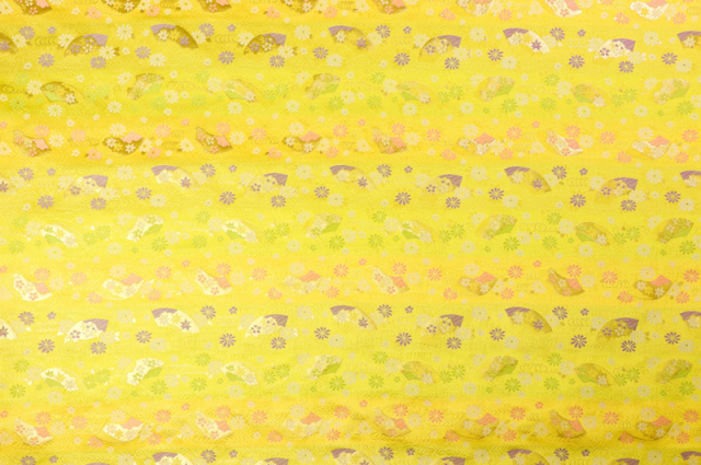 鮮やかな黄色地に、淡く優しい色合いの花々を扇を配した金襴生地です。