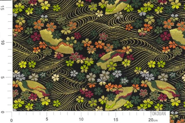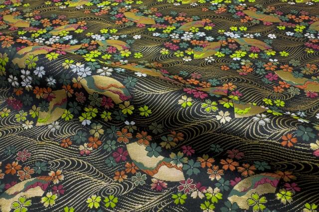 こちらの和柄生地は黒地に流れるような金糸の波文様を背景に、色とりどりの桜花が咲き誇る金襴生地です。 和の伝統美と華やかさを併せ持つ、袴地や和装小物はもちろん、バッグ、インテリア、舞台衣装などにも幅広くご使用いただける逸品です。