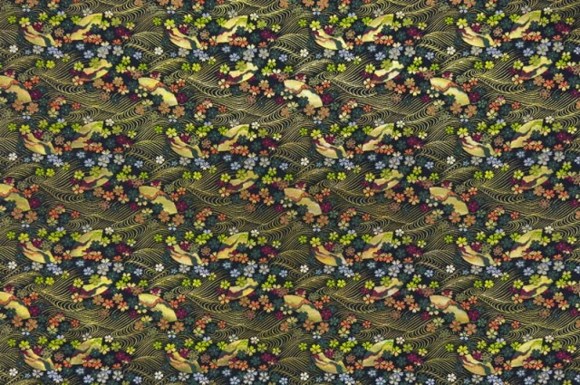 金らんと呼ばれるこの和模様の布地は、色や柄によりかっこいい、かわいい、エキゾチック、オリエンタル、豪華、高級、と印象が変わります。職人の技が詰まった一品で、和風の衣装やインテリアの装飾など多岐にわたる用途に応用できます。