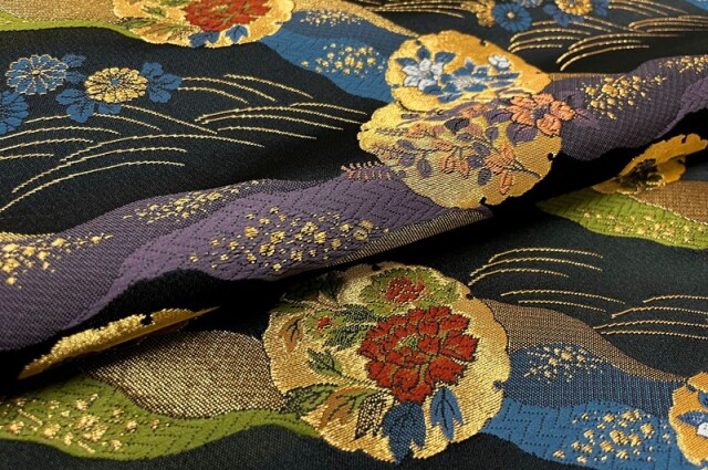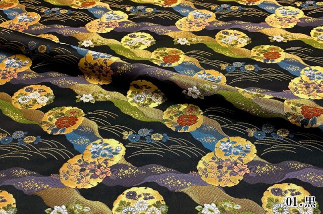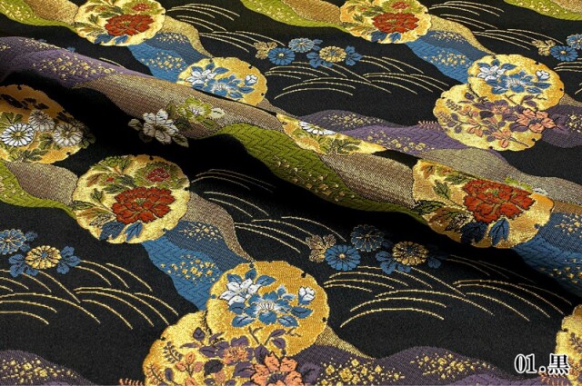 金らんと呼ばれるこの和模様の布地は、色や柄によりかっこいい、かわいい、エキゾチック、オリエンタル、豪華、高級、と印象が変わります。職人の技が詰まった一品で、和風の衣装やインテリアの装飾など多岐にわたる用途に応用できます。