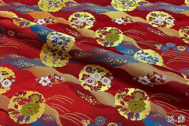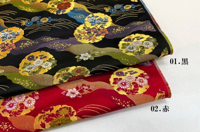 織地は、レッド、ブラックの2色展開です。ゴールドカラーの雪輪の中に、レッド、ブルー、グリーン、ホワイトなどの牡丹や菊の花々を織り込んだ、優雅な金襴生地で、大人の趣味から、お子様や園児、学生まで、幅広い層にご利用頂けます。宮司や僧侶など、伝統的な職業の方々にも重宝されているほか、インテリアやお土産品を製造する土産品製造者や工務店の方々にも人気の素材です。犬の服や小物にも使用されることから、ペット用のアパレルにも応用可能です。