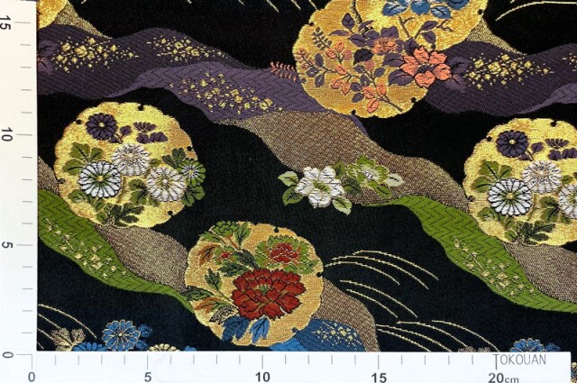 こちらの和柄生地は、赤、黒の2色展開の織地で、金糸の雪輪の中に、赤、青、緑、白色などの牡丹や菊の花々を織り込んだ、優雅な金襴生地です。どんなシーンでも使いやすい生地です。