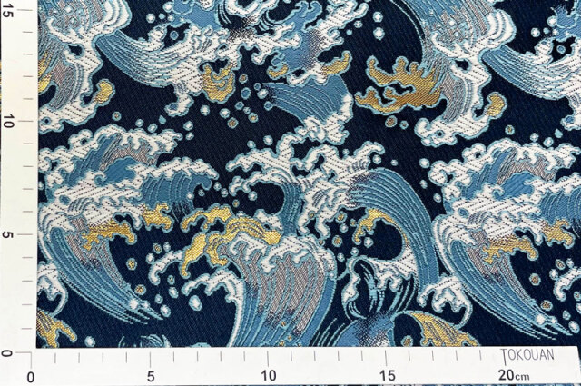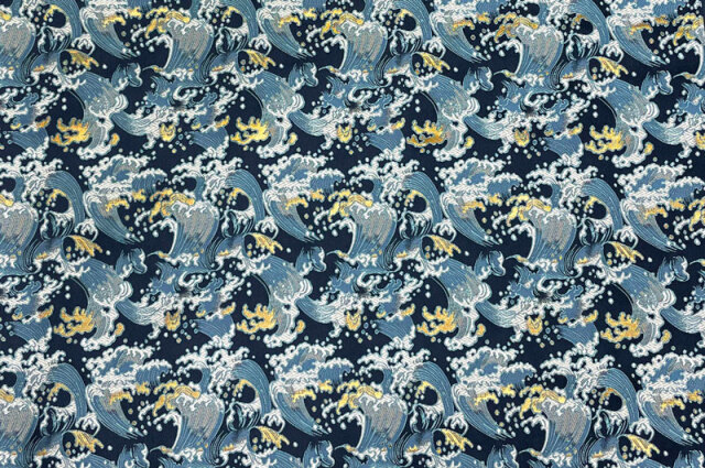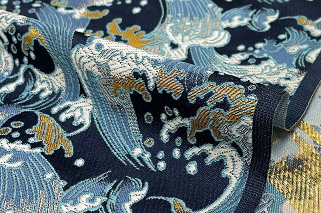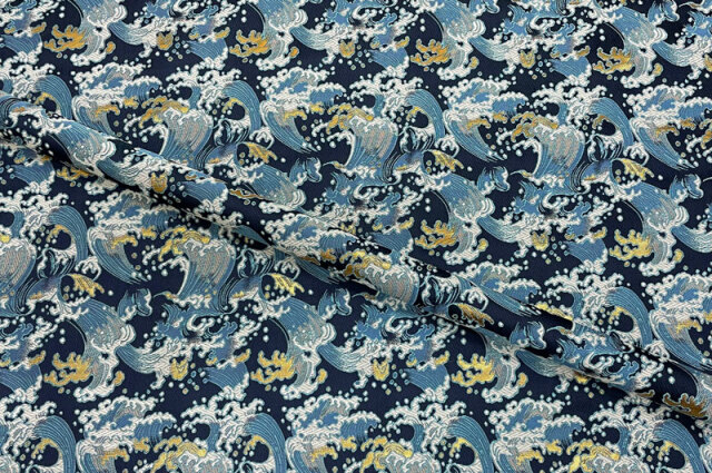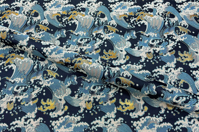 こちらの和柄生地は紺色の織地に白波を織り出した金襴生地です。シンプルなデザインでどんなシーンにもご利用頂けます。