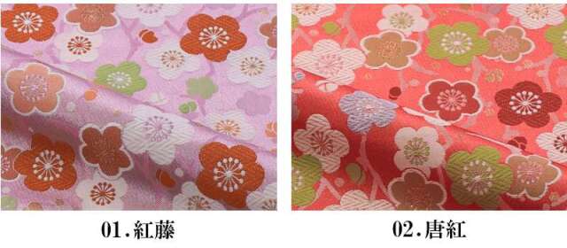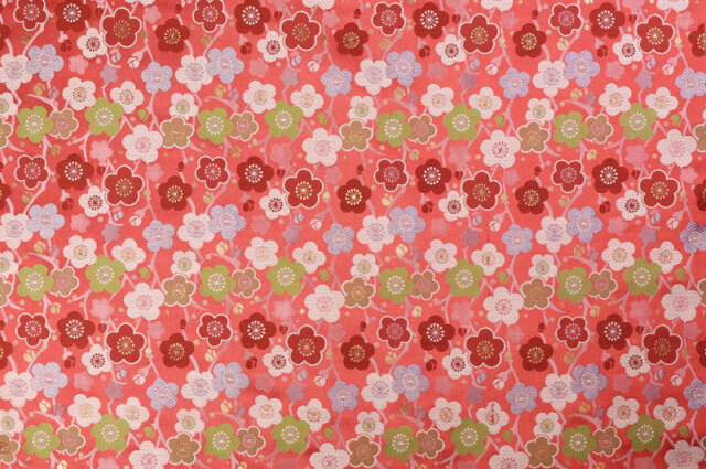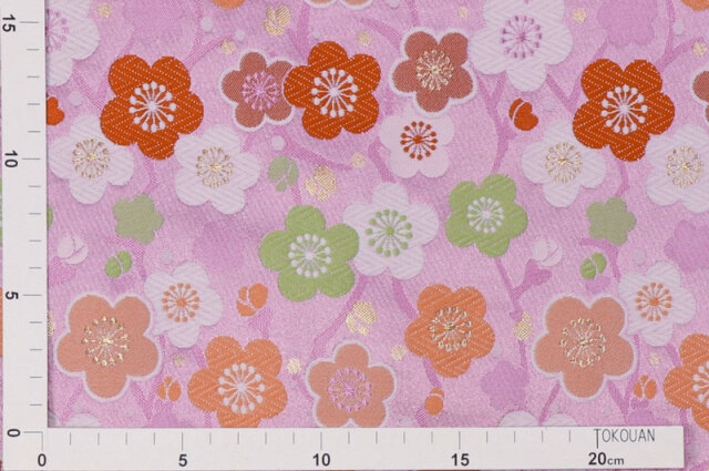 こちらの和柄生地は、赤みがかった淡い紫色の紅藤色と、赤系色の唐紅色の2色展開の織地に、白、緑、水色などの梅の花が華やかに配された金襴生地です。大人っぽくも可愛らしく、どんなシーンでも使いやすい生地です。