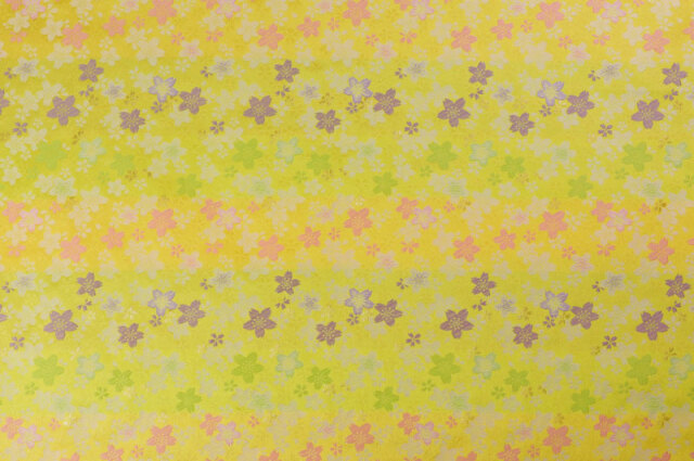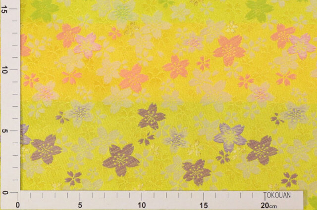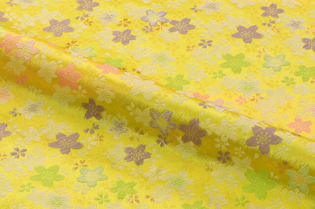 こちらの和柄生地は、淡い黄色の織地に、緑、桃色などの桜の花びらが華やかに配された金襴生地です。大人っぽくも可愛らしく、どんなシーンでも使いやすい生地です。