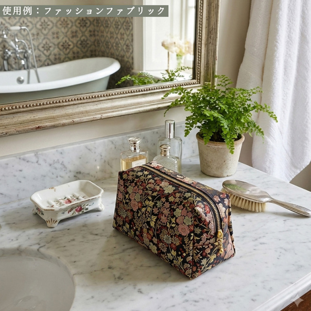 ブラックカラーの織地に、落ち着いたカラートーンのレッドやグリーンなどの草花文様を配した金襴生地は、大人から子どもまで幅広い世代に親しまれています。インテリアや土産品、ペット用衣装など、多様な分野で活用されています。