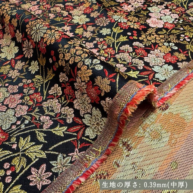 こちらの和柄生地は、黒色の織地に、落ち着いたカラートーンの赤や緑色などの草花文様が配された金襴生地です。どんなシーンでも使いやすい生地です。