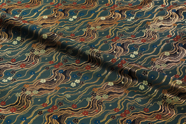 こちらの和柄生地は、緑系色の群緑色の織地で、赤、青、緑色などの小花が、水文を流れる金襴生地です。どんなシーンでも使いやすい生地です。