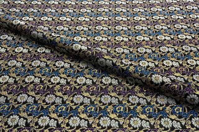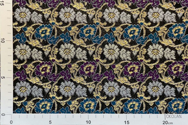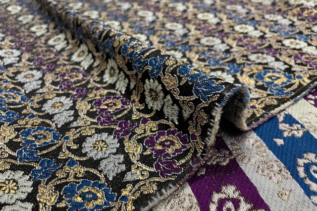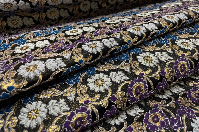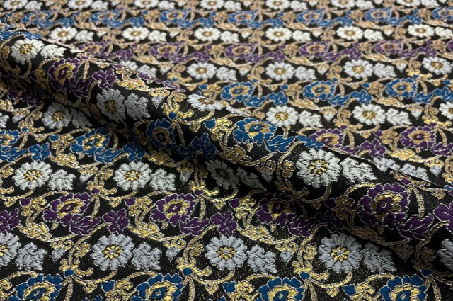 ブラックカラーの織地に、ホワイト、パープル、ゴールドカラーなどの菊や牡丹の花々が華やかに配された金襴生地で、大人の趣味から、お子様や園児、学生まで、幅広い層にご利用頂けます。宮司や僧侶など、伝統的な職業の方々にも重宝されているほか、インテリアやお土産品を製造する土産品製造者や工務店の方々にも人気の素材です。犬の服や小物にも使用されることから、ペット用のアパレルにも応用可能です。