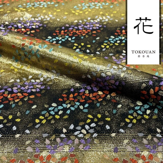 こちらの和柄生地は、織地は黒、緑、赤、桃、紫系色である藤色の5色展開で、桜の花びらが舞い散るように配された、華やかな金襴生地です。大人っぽくも可愛らしく、どんなシーンでも使いやすい生地です。