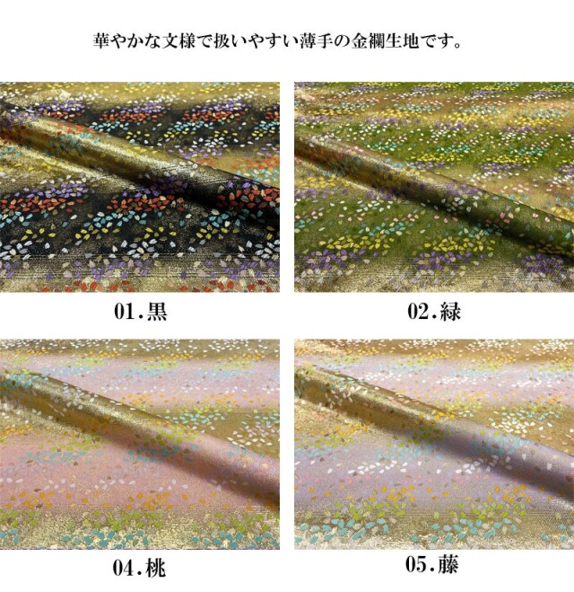 織地はブラック、グリーン、レッド、ピンク、パープル系色である藤色の5色展開です。桜の花びらが舞い散るように配された、華やかな金襴生地で、大人の趣味から、お子様や園児、学生まで、幅広い層にご利用頂けます。宮司や僧侶など、伝統的な職業の方々にも重宝されているほか、インテリアやお土産品を製造する土産品製造者や工務店の方々にも人気の素材です。犬の服や小物にも使用されることから、ペット用のアパレルにも応用可能です。