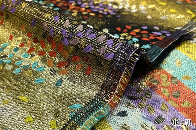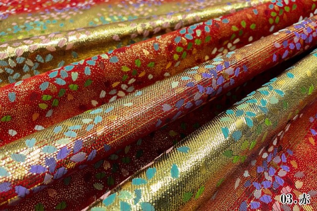 金らんと呼ばれるこの和模様の布地は、色や柄によりかっこいい、かわいい、エキゾチック、オリエンタル、豪華、高級、と印象が変わります。職人の技が詰まった一品で、和風の衣装やインテリアの装飾など多岐にわたる用途に応用できます。