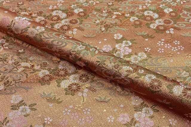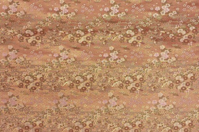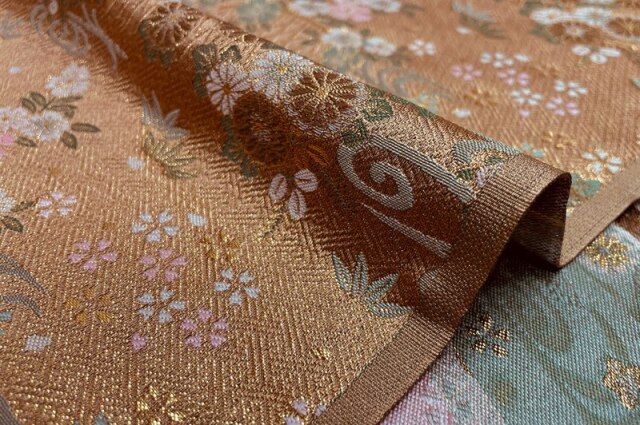 流れるような文様の観世水に、菊や桜などの花々を散らした上品な文様の金襴生地です。