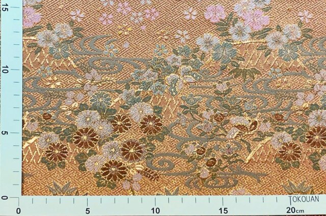 レッドカラー調の明るいブラウンカラーである遠州茶色の織地に、落ち着いたカラートーンのホワイトやピンク色などの花々が配された金襴生地で、大人の趣味から、お子様や園児、学生まで、幅広い層にご利用頂けます。宮司や僧侶など、伝統的な職業の方々にも重宝されているほか、インテリアやお土産品を製造する土産品製造者や工務店の方々にも人気の素材です。犬の服や小物にも使用されることから、ペット用のアパレルにも応用可能です。