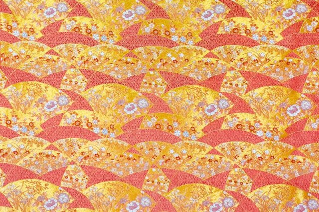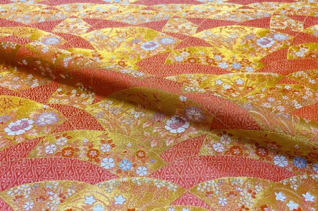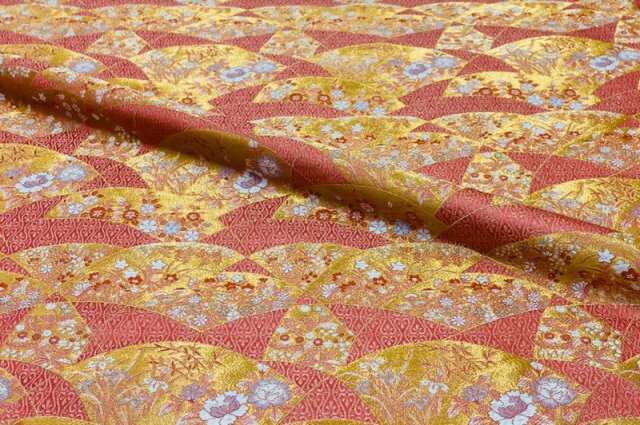 波のように、連続して表現された扇文様の中に色とりどりの花が繊細に織り込まれた金襴織物生地です。