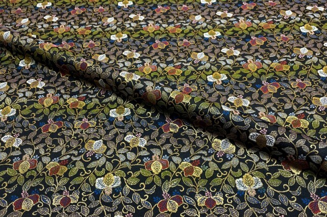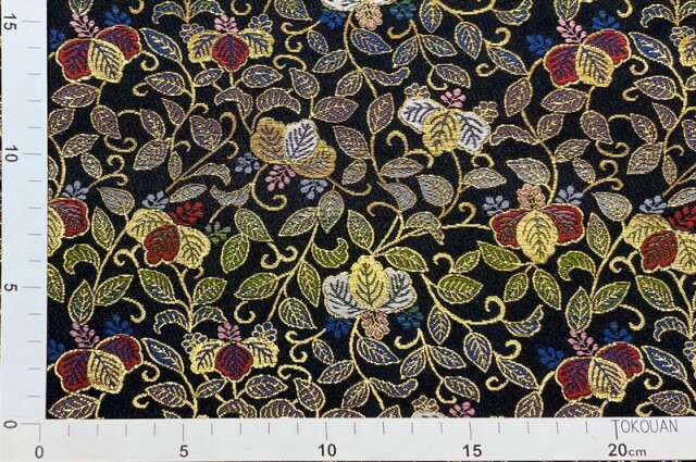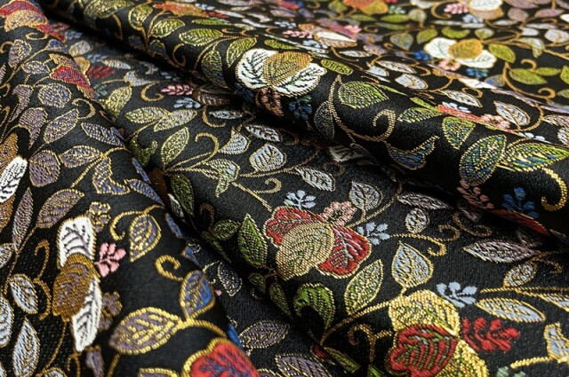 ブラックカラーの織地に、レッド、イエロー、ホワイト、グリーン、ブルー、ピンク色などの草花が華やかに配された金襴生地で、大人の趣味から、お子様や園児、学生まで、幅広い層にご利用頂けます。宮司や僧侶など、伝統的な職業の方々にも重宝されているほか、インテリアやお土産品を製造する土産品製造者や工務店の方々にも人気の素材です。犬の服や小物にも使用されることから、ペット用のアパレルにも応用可能です。