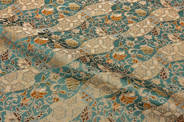 金らんと呼ばれるこの和模様の布地は、色や柄によりかっこいい、かわいい、エキゾチック、オリエンタル、豪華、高級、と印象が変わります。職人の技が詰まった一品で、和風の衣装やインテリアの装飾など多岐にわたる用途に応用できます。