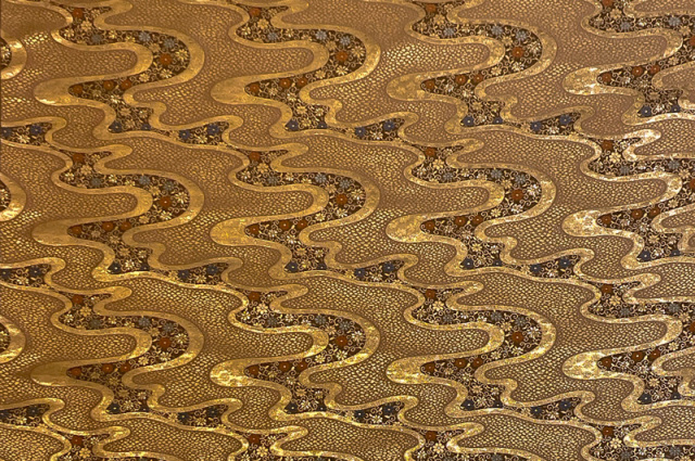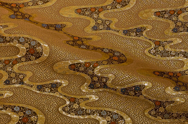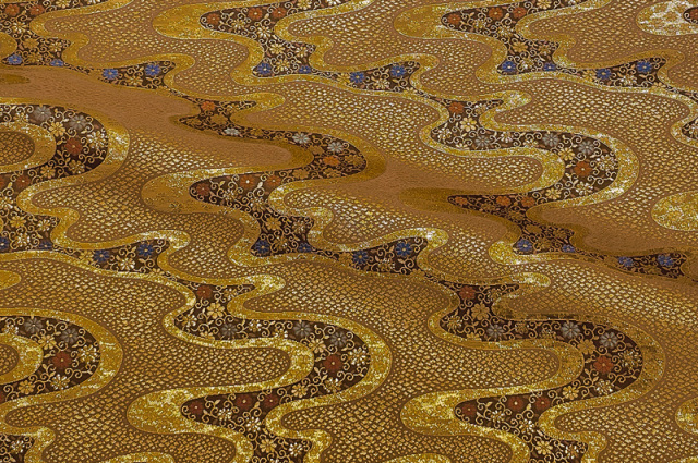 小さな粒を撒いたような地模様に輝く金糸で流水を表現した落ち着いた中にも華やかなふんいきをまとった金襴生地です。