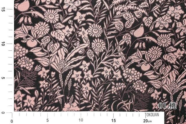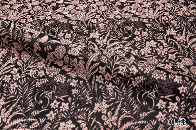 濃紺の地にカラフルな色糸で草花や果実を織り込んだ生地は大人の趣味から、お子様や園児、学生まで、幅広い層にご利用頂けます。宮司や僧侶など、伝統的な職業の方々にも重宝されているほか、インテリアやお土産品を製造する土産品製造者や工務店の方々にも人気の素材です。犬の服や小物にも使用されることから、ペット用のアパレルにも応用可能です。