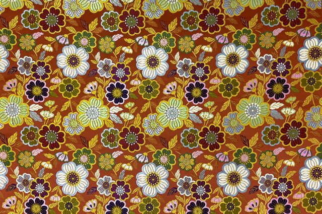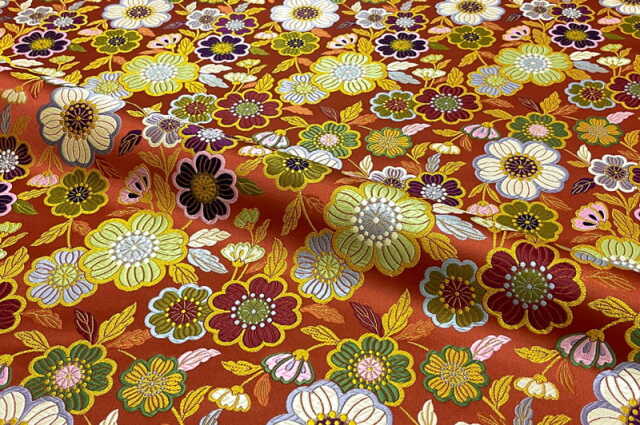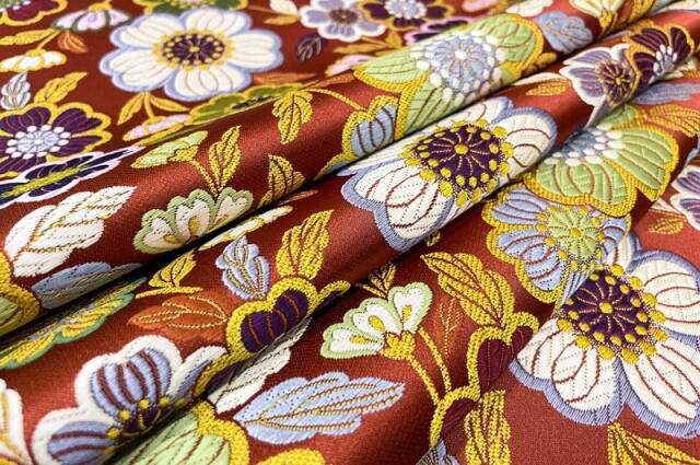 こちらの和柄生地は艶やかなマルーン色の地に大輪の花々が色とりどりに咲き誇る無金の金襴生地です。