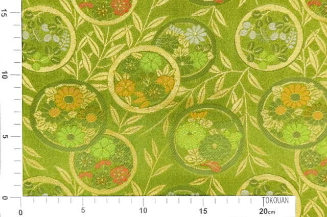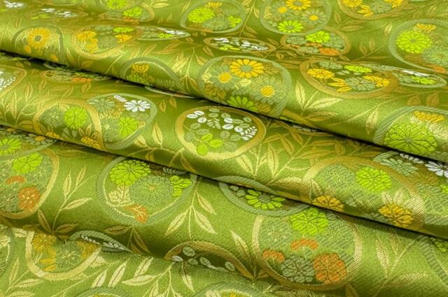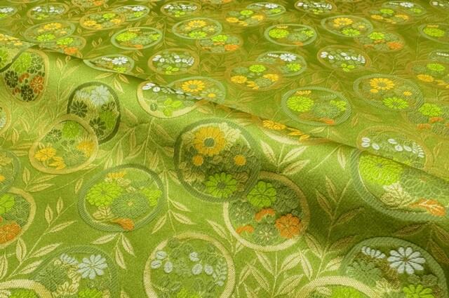こちらの生地は深いグリーンの地色に、ゴールドで縁取られた丸文の中へ四季折々の草花を織り込んだ、雅やかな金襴生地です。緑地に映える金糸と花々の彩りが、華やかでありながら落ち着いた印象を与え、和の美を存分に楽しめる一枚となっております。