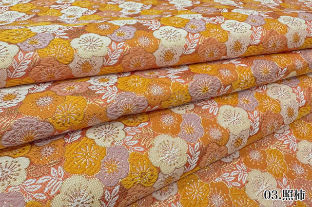 こちらの生地はグレー、ピンク、オレンジの地に、ゴールドで縁取られた繊細な花々を織り込んだ、華やかな金襴生地です。古典的な文様でありながら柔らかなトーンと光沢が、現代のインテリアや小物にも調和する気品ある文様の生地です。