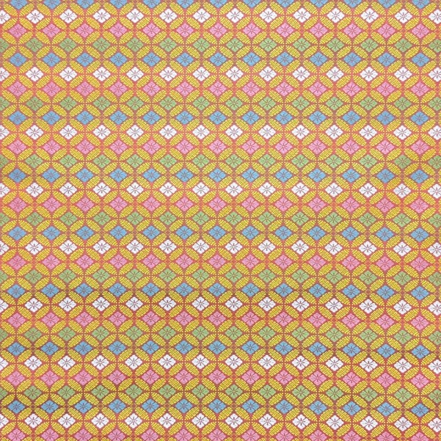 濃いピンクの地にイエローやブルー、グリーンのカラフルな文様が華やかに配された無金の金襴生地は、上品な光沢と風合いから、大人から子どもまで幅広い世代に親しまれています。