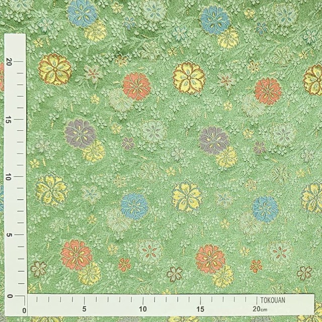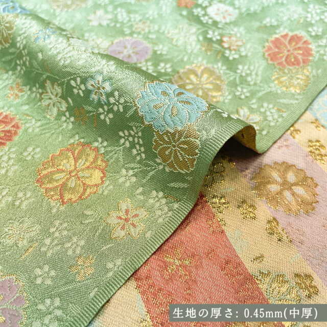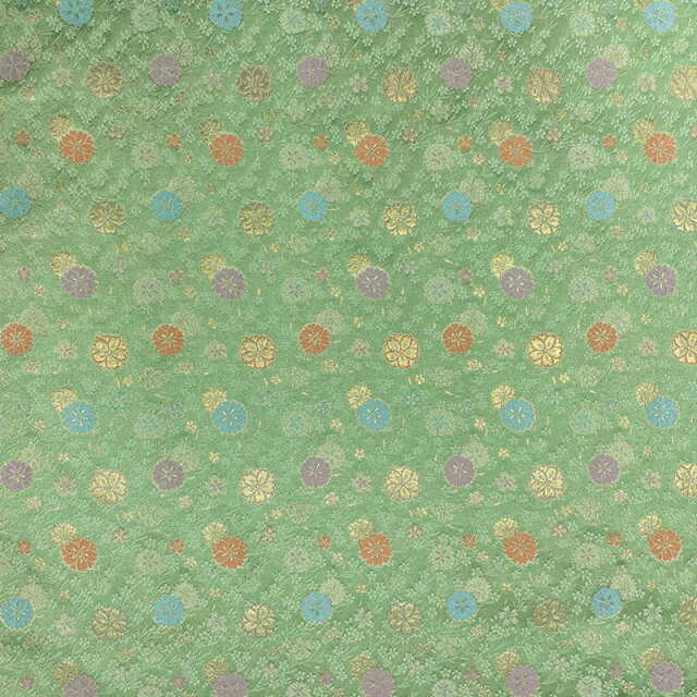 こちらの和柄生地は、若草色の織地に、紫、オレンジ、水色などの桜が配された、華やかな金襴生地です。どんなシーンでも使いやすい生地です。
